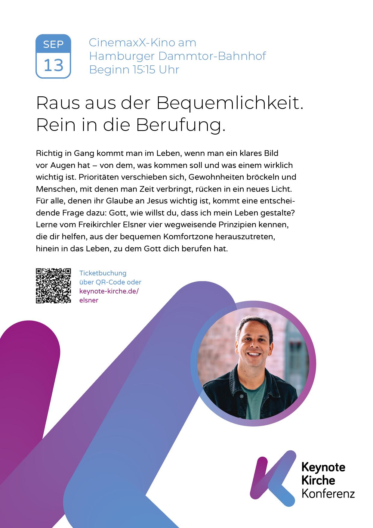 Gernot Elsner möchte das Publikum der Glaubenskonferenz in Hamburg motivieren, sich mit dem zu befassen, was Gott für ihr Leben will. Der Vortrag findet am 13. September 2025 um 15.15 Uhr im CinemaxX am Dammtor im Rahmen der Keynote Kirche Konferenz der Neuapostolischen Kirche Nord- und Ostdeutschland statt.
